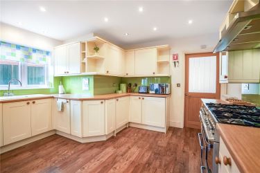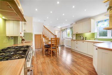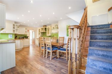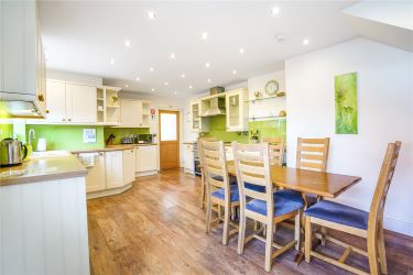 Entry to the house is from the side, through a glazed door that opens into a bright kitchen/dining room. This room features Shaker-style units with wooden worktops, a large range cooker, and integrated appliances, including a fridge, freezer, and dishwasher. Glass splashbacks add a pop of color, and a double ceramic sink sits beneath the window. Adjacent is a utility area with space for a washing machine, a Worcester Bosch boiler, and extra storage. The ground floor also includes a cloakroom with a WC and washbasin.