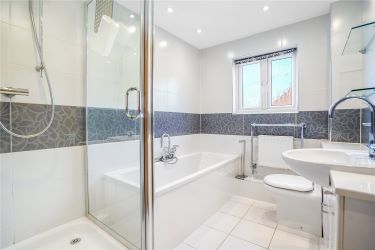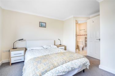 Upstairs, the landing features a useful airing cupboard. The master bedroom boasts breathtaking views from its front window, built-in wardrobes, and an ensuite with a corner shower. Two additional bedrooms are located at the rear and side of the house. The family bathroom includes a bath, separate shower, and modern fittings, while all rooms feature fitted carpets and radiators.