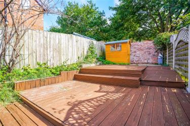 Outside, the property offers a secluded terrace with steps leading to a low-maintenance garden. Raised beds with decorative slate shale and a path leading to a deck make this a perfect spot for outdoor dining while taking in the expansive views. A greenhouse and shed are located at the top of the garden, all enclosed by decorative fencing to create a peaceful and private retreat.